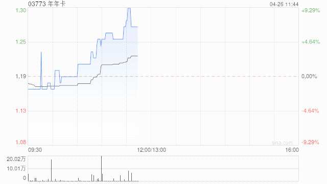 年年卡(03773)早盤(pán)上漲5.04%,報(bào)1.25港元,成交額107.692萬(wàn)港元。