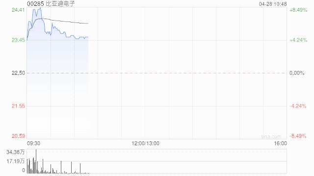 比亞迪電子(00285)早盤高開 ,上漲6.67%,現(xiàn)報(bào)24.00港元,成交額6880.340萬港元。