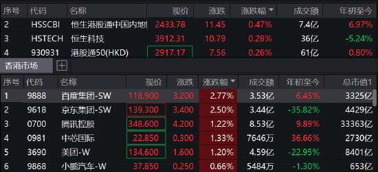 港股恒指盤初高開低走,目前漲幅收窄至0.05%,恒生科技指數(shù)收窄至0.28%,此前一度漲超2%,百度、京東等漲幅收窄至不足3%。