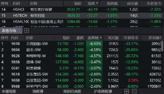 恒生科技指數(shù)跌幅擴(kuò)大至2%,萬(wàn)國(guó)數(shù)據(jù)跌近7%,蔚來(lái)、嗶哩嗶哩跌近5%,京東集團(tuán)、百度集團(tuán)跌近3%。