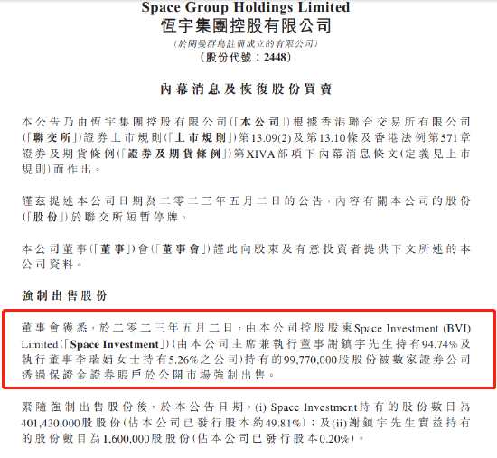 恒宇集團(tuán)昨日閃崩89%后停牌,今日恒宇集團(tuán)高開(kāi)15%后再度轉(zhuǎn)跌逾3%,5月3日公司在港交所公告稱,控股股東Space Investment持有的9977萬(wàn)股股份被數(shù)家證券公司透過(guò)保證金證券賬戶于公開(kāi)市場(chǎng)強(qiáng)制出售;董事會(huì)預(yù)計(jì)此次強(qiáng)制出售股份事件不會(huì)對(duì)公司營(yíng)運(yùn)產(chǎn)生重大不利影響,股票復(fù)牌。