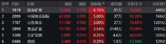 避險情緒升級,倫敦黃金突破2000美元關(guān)口,中國黃金國際漲5%,招金礦業(yè)漲超6%,紫金礦業(yè)、山東黃金(600547)漲超2.5%。