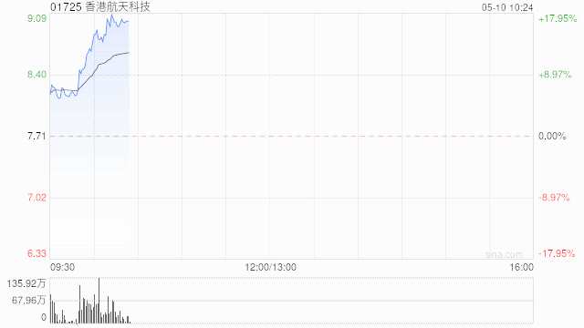 香港航天科技(01725)早盤高開上漲8.17%,報8.34港元,成交額4699.313萬港元。