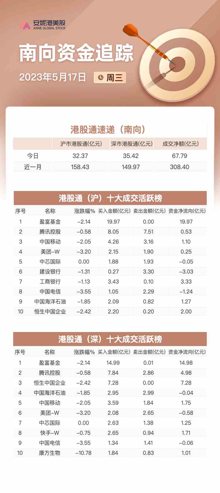 5月17日訊(編輯 馬軼杰)據(jù)Wind數(shù)據(jù)顯示,南向資金當(dāng)日成交287.68億港元,凈流入67.79億港元。其中滬港股通凈流入32.37億港元,深港股通凈流入35.42億港元。
