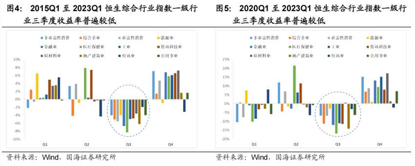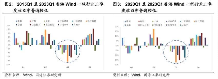分別考慮全樣本以及2020年Q1至2023年Q1樣本下的香港一級(jí)行業(yè)平均漲跌幅,國海證券(000750)發(fā)現(xiàn)就全年而言,一季度是行業(yè)分化最為嚴(yán)重的時(shí)間段,二季度行情好轉(zhuǎn)但依舊有較大分化,三季度表現(xiàn)最為糟糕,而四季度表現(xiàn)則最為亮眼。該結(jié)論在兩種樣本下均成立,港股“季節(jié)效應(yīng)”有跡可循。