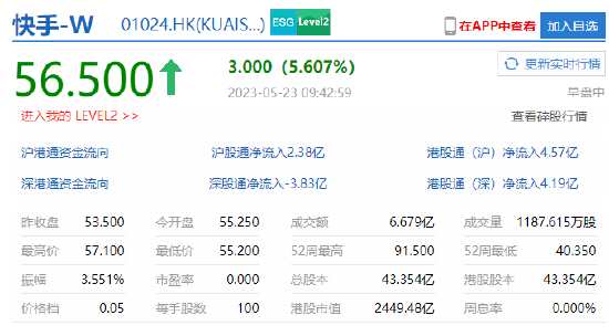 5月23日消息,快手績(jī)后高開(kāi)高走,盤中漲超6%,截至發(fā)稿,快手漲5.6%,股價(jià)報(bào)56.5港元,成交近7億港元。