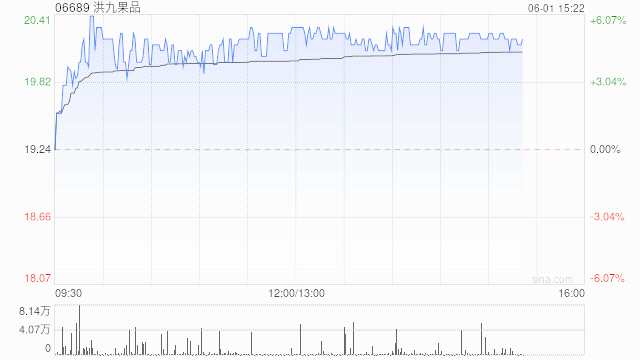 洪九果品(06689)午盤上漲5.25%,現(xiàn)報20.25港元,成交額2965.092萬港元。