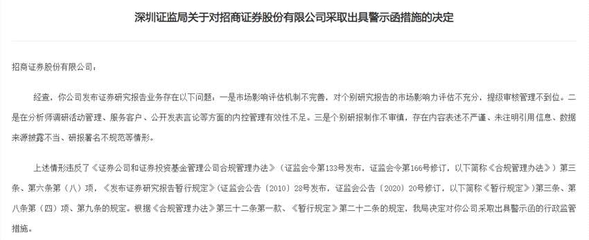 發(fā)布證券研報業(yè)務(wù)存多項問題 招商證券(06099)收深圳證監(jiān)局警示函