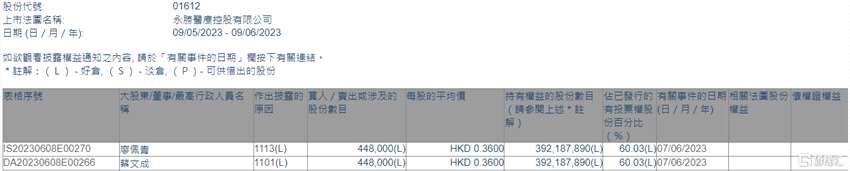 互聯(lián)網(wǎng)6月9日丨根據(jù)聯(lián)交所最新權(quán)益披露資料顯示,2023年6月7日,永勝醫(yī)療(01612.HK)獲主席兼執(zhí)行董事蔡文成在場(chǎng)內(nèi)以每股均價(jià)0.36港元增持44.8萬(wàn)股,涉資約16.13萬(wàn)港元。