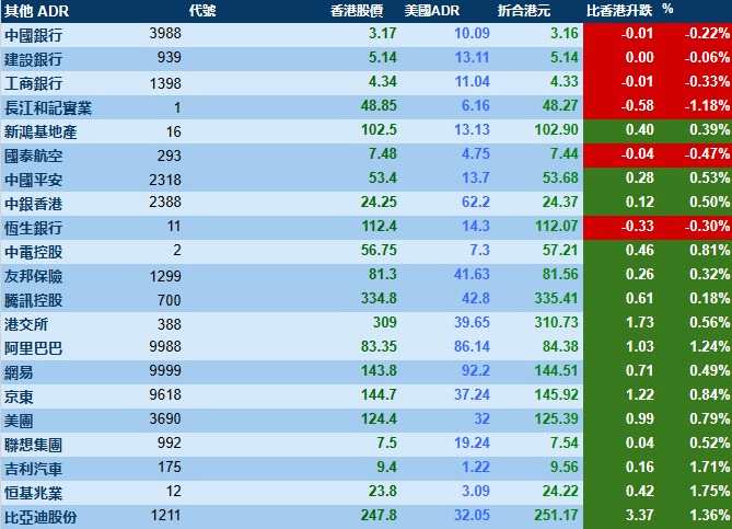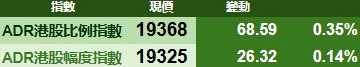 周四,美股三大指數(shù)集體收漲,港股ADR指數(shù)上漲,按比例計算,收報19368點,較香港收市張68.59點或0.35%。