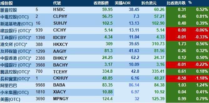 摘要: 周四,美股三大指數(shù)集體收漲,港股ADR指數(shù)上漲,按比例計算,收報19368點,較香港收市張68.59點或0.35%。大型藍籌股多數(shù)上漲,匯豐控股收報60.26港元,