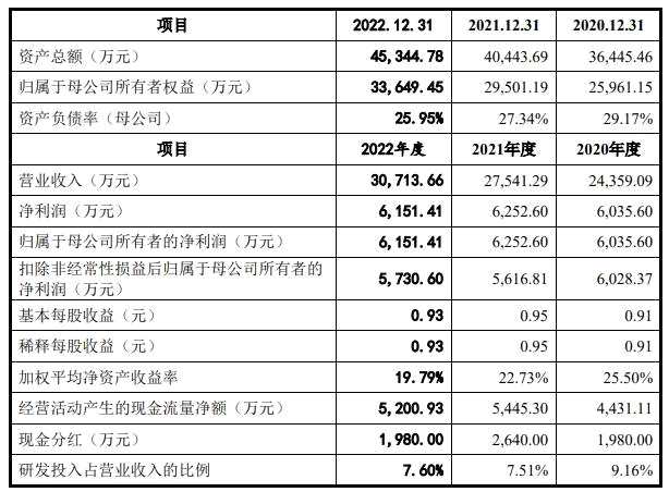 財(cái)務(wù)方面,于2020年度、2021年度及2022年度,公司實(shí)現(xiàn)營(yíng)業(yè)收入分別約為2.44億元、2.75億元及3.07億元。公司凈利潤(rùn)分別約為6035.6萬(wàn)元、6252.6萬(wàn)元及6151.41萬(wàn)元人民幣。