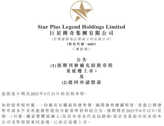 巨星傳奇公告稱,董事會宣布將會延遲全球發(fā)售及上市,且公司預(yù)期刊發(fā)補(bǔ)充招股章程,修訂及補(bǔ)充招股章程連同經(jīng)更新上市時(shí)間表、申請香港發(fā)售股份的相關(guān)程序以及其他相關(guān)資料。公司仍致力盡快完成全球發(fā)售及上市。
