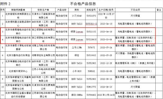其中,11組不合格批樣品中,有2組為商標為綠源Luyuan的電動自行車,標稱生產(chǎn)者為浙江綠源電動車有限公司,被抽樣銷售者為北京華泰懋隆電動自行車商行,規(guī)格型號為TDT2213Z的產(chǎn)品不符合項為充電器與蓄電池(蓄電池防篡改),規(guī)格型號為TDT22063Z的產(chǎn)品不符合項為整車質(zhì)量、控制系統(tǒng)(過流保護功能)、充電器與蓄電池(蓄電池防篡改)。