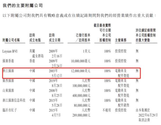 招股書顯示,浙江綠源電動車有限公司為一家于2003年5月12日在中國成立的有限責任公司,為綠源集團全資附屬公司。