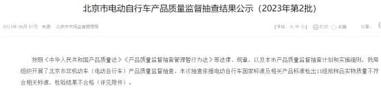 互聯(lián)網(wǎng)北京6月12日訊 近日,北京市市場監(jiān)督管理局網(wǎng)站公布了《北京市電動自行車產(chǎn)品質(zhì)量監(jiān)督抽查結(jié)果公示(2023年第2批)》,本次抽查依據(jù)電動自行車國家標準及相關(guān)產(chǎn)品標準檢出11組批樣品實物質(zhì)量不符合相關(guān)標準,檢驗結(jié)果不合格。