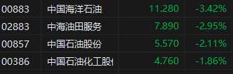 隔夜國(guó)際油價(jià)重挫,拖累今早港股“三桶油”下跌。中石油、中石化、中海油均跌超2%。美國(guó)公布通脹數(shù)據(jù)及美聯(lián)儲(chǔ)議息前夕,高盛降低油價(jià)目標(biāo)的消息、加深市場(chǎng)對(duì)原油需求顯著放緩的憂慮,國(guó)際油價(jià)周一受壓,紐約期油挫4.35%,每桶收?qǐng)?bào)67.12美元;布蘭特期油急插3.94%,收?qǐng)?bào)71.84美元。