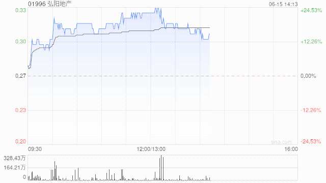 弘陽地產(01996)午盤上漲15.09%,現報0.305港元,成交額1748.617萬港元。