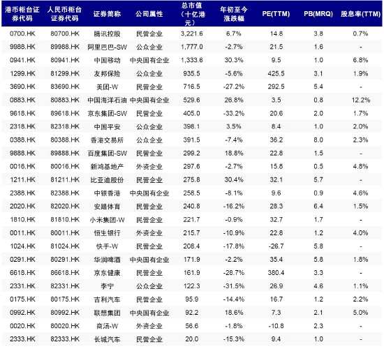符合市值、流動性要求的港股公司可增設(shè)人民幣柜臺。合資格證券是由港交所指定,擁有港幣和人民幣柜臺,并符合雙柜臺莊家計劃資格的證券。具體標(biāo)準(zhǔn)上,包括證券市值、流動性等,且要滿足雙柜臺莊家的資格[1]。盡管具體市值與流動性標(biāo)準(zhǔn)暫未明確公布,但從當(dāng)前合資格的雙柜臺證券名單看,現(xiàn)階段主要集中于大盤藍籌股。具體名單由港交所不定時公布,并將定期或臨時檢視。程序方面,上市發(fā)行人需向港交所遞交申請,申請并無特定時間表,也無需費用。