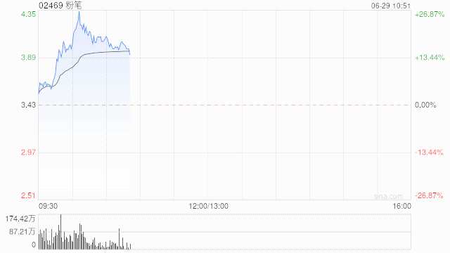 粉筆(02469)早盤高開高走,上漲17.49%,現報4.03港元,成交額1.586億港元。