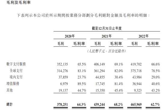于2020年、2021年及2022年,公司的毛利率分別為64.3%、68.2%及62.7%。其中,全球支付的毛利率分別為83.1%、82.0%及78.5%,境內(nèi)支付的毛利率分別為23.7%、30.4%及29.0%。