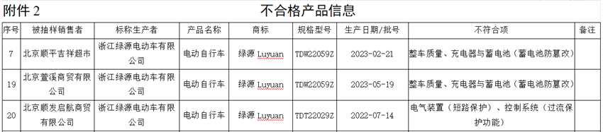 標稱生產者為浙江綠源電動車有限公司的3批次電動自行車登榜,商標均為綠源Luyuan。其中,規(guī)格型號為TDW22059Z的2批次產品不符合項為整車質量、充電器與蓄電池(蓄電池防篡改),被抽樣銷售者分別為北京順平吉祥超市、北京萱溪商貿有限公司,生產日期/批號分別為2023-02-21以及2023-05-19;規(guī)格型號為TDT22029Z的1批次產品不符合項為整電氣裝置(短路保護)、控制系統(tǒng)(過流保護功能),被抽樣銷售者為北京順發(fā)啟航商貿有限公司,生產日期/批號為2022-07-14。