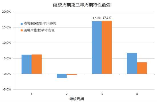 不過,須留意的是,從這總統(tǒng)周期第三年隨后的發(fā)展,縱使標(biāo)指見這周期的頂部后,惟回落的幅度亦十分溫和。且于這周期后段,即第四季較后時(shí)間,美股往往將重拾升浪,并且延續(xù)至“總統(tǒng)周期”第四年較后時(shí)間(但上升幅度不及總統(tǒng)周期第三年)。