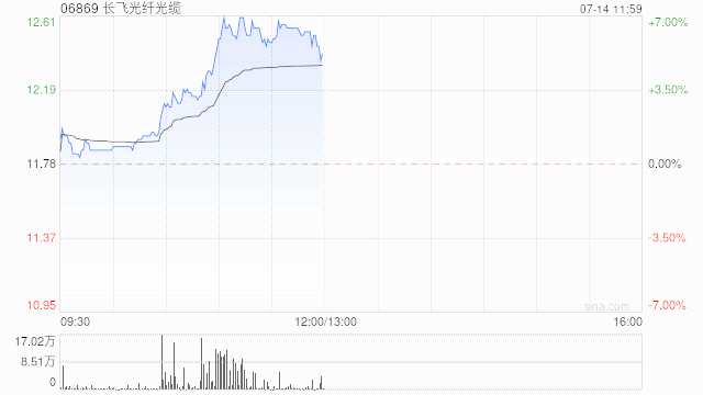 長飛光纖光纜(06869)午盤漲幅持續(xù)擴大,上漲6.62%,現(xiàn)報12.56港元,成交額3861.210萬港元。