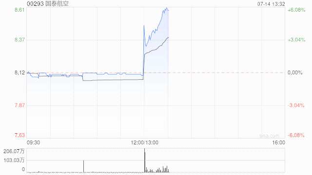 國泰航空(00293)午后上升4.56%,現(xiàn)報8.59港元,成交額1.360億港元。