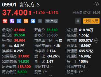 新東方漲近5%,報(bào)37.4港元,總市值635.57億港元,股價(jià)創(chuàng)2021年以來(lái)新高。消息面上,新東方官微今日發(fā)布消息稱,新東方將正式開(kāi)拓文旅事業(yè)。并表示這一次要做的是面向中老年人,提供有文化幸福感、有知識(shí)獲得感、有個(gè)人追求感的高品質(zhì)文旅服務(wù)。