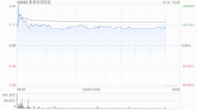 香港資源控股(02882)今日復(fù)牌,早盤一度飆漲逾44%,現(xiàn)漲18.97%,報(bào)0.69港元,成交額1167.974萬(wàn)港元。