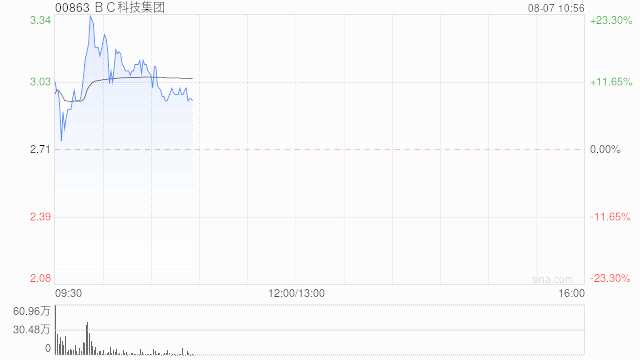 BC科技集團(tuán)(00863)早盤高開,上漲10.70%,現(xiàn)報(bào)3港元,成交額1790.649萬(wàn)港元。