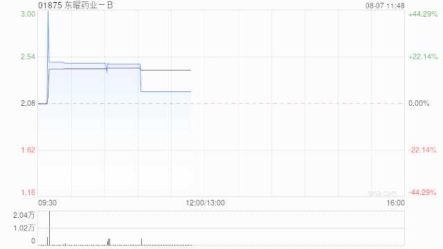 東曜藥業(yè)-B(01875)早盤一度漲超44%,高見3港元;現(xiàn)回落僅漲5.77%,報(bào)2.220港元,成交額9.932萬港元,港股市值17.00億港元。