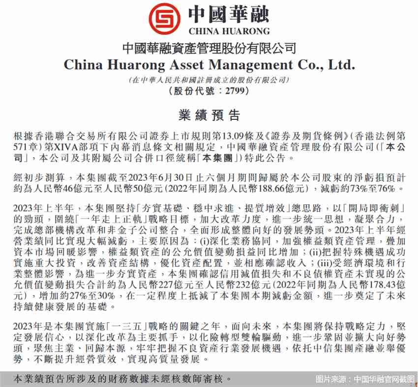 中國(guó)華融:預(yù)計(jì)上半年凈虧損約46億至50億元 同比減虧約73%至76%
