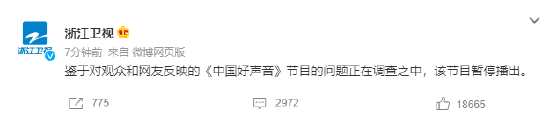 8月25日消息,據(jù)浙江衛(wèi)視官方微博消息,鑒于對觀眾和網(wǎng)友反映的《中國好聲音》節(jié)目的問題正在調(diào)查之中,該節(jié)目暫停播出。