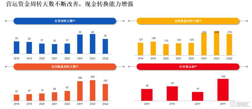 細(xì)看公司資金使用情況上,今年上半年資金周轉(zhuǎn)效率持續(xù)改善,現(xiàn)金轉(zhuǎn)換能力增強(qiáng),經(jīng)營現(xiàn)金流上升顯著。根據(jù)公司公告顯示,公司在庫存周轉(zhuǎn)天數(shù)、應(yīng)收賬款周轉(zhuǎn)天數(shù)以及應(yīng)付賬款周轉(zhuǎn)天數(shù)上,今年二季度顯著回落,資金周轉(zhuǎn)效率提高。截止2023年6月30日,公司現(xiàn)金以及現(xiàn)金等價物達(dá)到16.44億元,同比增長69.4%,現(xiàn)金流充裕。
