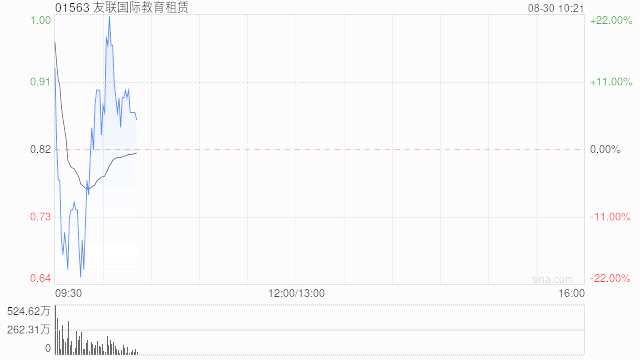 友聯(lián)國(guó)際教育租賃(01563)今日復(fù)牌,早盤上度漲超34%,高見1.15港元,現(xiàn)漲幅回落至漲17.07%,報(bào)0.96港元,成交額6702.68萬港元。