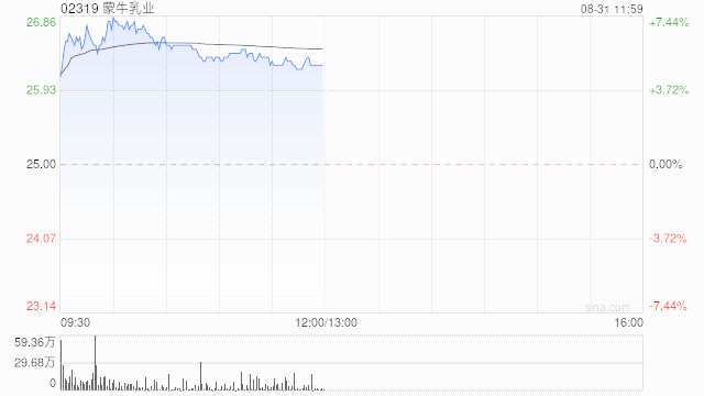 蒙牛乳業(yè)(02319)早盤(pán)高開(kāi),股價(jià)現(xiàn)漲5%,報(bào)26.25港元,成交額3.194億港元。