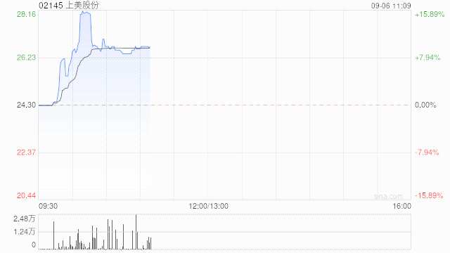 上美股份(02145)早盤上漲8.64%,現(xiàn)報(bào)26.40港元,成交額785.887萬(wàn)港元。