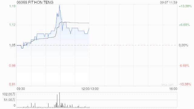 鴻騰精密(06088)盤中曾漲超13%,高見1.19港元,股價(jià)回落至漲3.81%,現(xiàn)報(bào)1.09港元,成交額845.467萬港元。