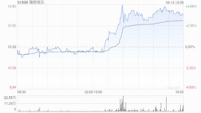 貓眼娛樂(01896)尾盤上漲3.49%,現(xiàn)報10.68港元,成交額4065.470萬港元。