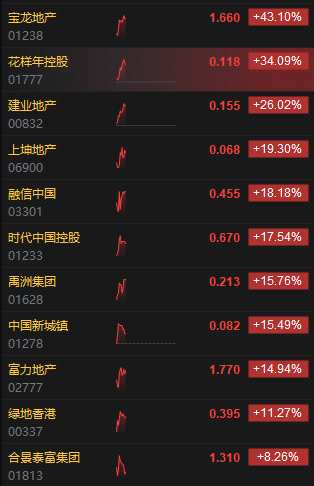 9月13日消息,地產(chǎn)股集體飆升,截至發(fā)稿,寶龍地產(chǎn)漲超43%,花樣年控股漲超34%,建業(yè)地產(chǎn)漲超26%。