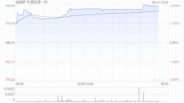 中通快遞-W(02057)午盤上漲3.60%,現(xiàn)報192.80港元,成交額2.742億港元。