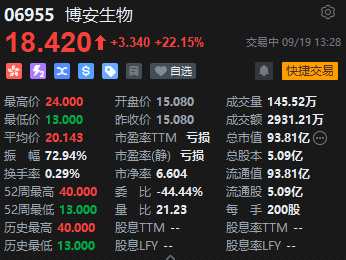 9月19日消息,截至發(fā)稿,博安生物上漲22.15%,報(bào)18.42港元,總市值93.81億港元。