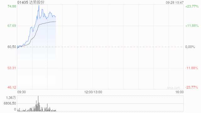 達(dá)勢(shì)股份(01405)早盤曾放量漲超23%,高見74.85港元,創(chuàng)上市新高,總市值逼近100億港元?,F(xiàn)稍回落上漲19.09%,報(bào)72.05港元,成交額3.21億港元。
