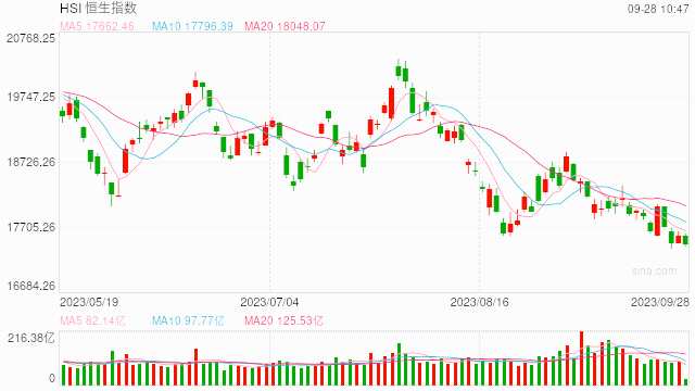 9月28日消息,美股周三反覆偏軟,債息持續(xù)向上,加上華府停擺消息困擾大市表現(xiàn),道指一度跌幅超過(guò)300點(diǎn),尾市跌幅有所收窄,標(biāo)普500指數(shù)及納指則輕微倒升收市。美元持續(xù)強(qiáng)勢(shì),美國(guó)十年期債息上升至4.6厘水平,金價(jià)顯著受壓,油價(jià)繼續(xù)向上。今日港股三大指數(shù)低開(kāi)低走,截至午間收盤(pán),恒生指數(shù)跌1.04%,報(bào)17429.46點(diǎn),恒生科指跌1.59%,國(guó)企指數(shù)跌0.99%。盤(pán)面上,核心科技股集體下跌,美團(tuán)跌超3%,網(wǎng)易跌超2%,京東集團(tuán)、小米集團(tuán)、騰訊控股跌超1%;汽車(chē)股漲跌不一,理想跌近2%,小鵬汽車(chē)漲超1%;內(nèi)房股普跌,旭輝控股集團(tuán)跌超9%;風(fēng)電股逆勢(shì)上漲,龍?jiān)措娏q超3%;煤炭股漲幅居前,南戈壁漲近17%;互聯(lián)網(wǎng)醫(yī)療股下挫,阿里健康、京東健康跌超5%;今日三只新股上市,第四范式漲超5%、東軟熙康跌近32%、中旭未來(lái)跌超1%;另外,中國(guó)恒大、恒大物業(yè)、恒大汽車(chē)在港交所暫時(shí)停牌。