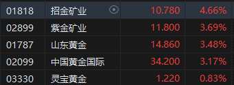 黃金股漲幅靠前,招金礦業(yè)漲超4%。消息面上,巴勒斯坦以色列爆發(fā)新一輪沖突,市場避險情緒升溫,現(xiàn)貨黃金大幅攀升,金價一度上漲逾20美元,創(chuàng)一周新高至1855.25美元/盎司。