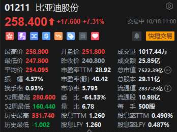 10月18日消息,受益于前三季度業(yè)績預(yù)期大幅增加,周三比亞迪股份開盤即高開,截至發(fā)稿,該公司H股漲7.31%,報258港元。