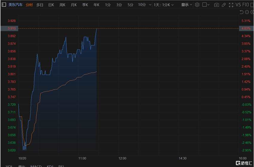 摘要: 連續(xù)下跌的美東汽車(1268.HK)反彈4.8%,現(xiàn)報(bào)3.91港元,總市值52.6億港元。消息上,公司在18日再獲葉帆增持20.4萬(wàn)股普通股股份,價(jià)值約74.29萬(wàn)港元;在16日葉帆已增持公司100萬(wàn)