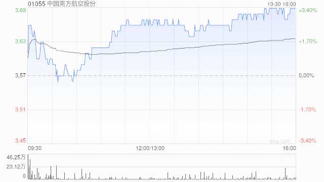 南方航空(01055)尾盤上漲3.36%,現(xiàn)報3.69港元,成交額2871.52萬港元。